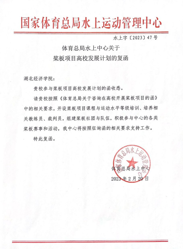 学校2013年获批组建汤逊湖水上运动教学基地,该基地毗邻校园,可使用水域面积近2000亩,目前开设有桨板、龙舟、皮划艇等体育专业课程,在推广开展水上体育运动项目具有得天独厚的资源条件。此次作为湖北省首批入选国家体育总局桨板项目发展计划桨板项目高校,公司将积极落实“健康中国”“体育强国”战略,充分挖掘水上运动资源,积极探索体教融合创新发展新路径,构建更为丰富的水上运动项目课程体系,承担省内高校开展桨板训练、桨板运动水平等级培训和相关赛事,为桨板项目在我省广泛发展贡献经院力量。