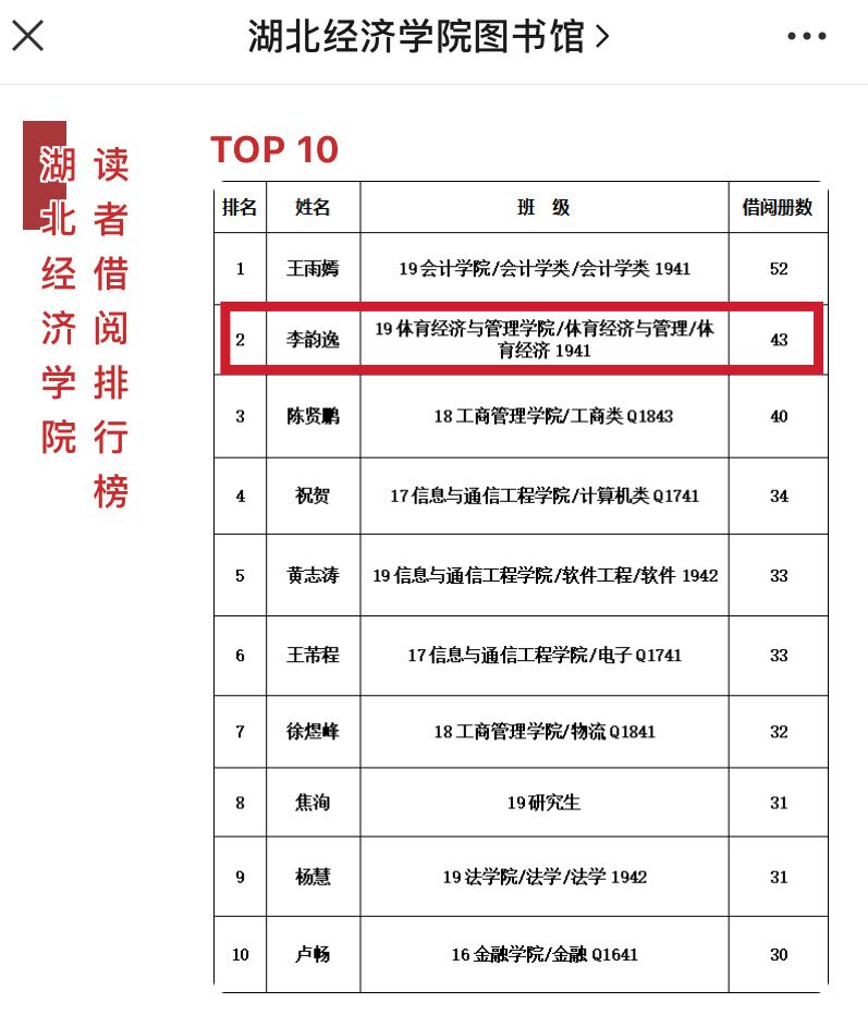 (通讯员 魏琳宜)在欢迎来到公赌船jcjc7102020年度“书香伴我行”读书月活动中,开展了“书香院系”和“借阅之星”的评选活动,根据统计情况,公司体育经济1941班李韵逸同学获评2020年度校园十大“借阅之星”。