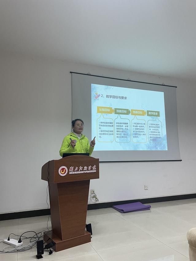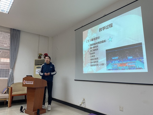 参赛教师精心准备,以饱满的精神状态参加授课竞赛。竞赛现场精彩纷呈,褚媛老师讲授了艺术题材基训的第一环节——站姿;谢作为老师分享了体育舞蹈中牛仔舞踢腿动作的衍生动作展示;曾鸣老师讲解了排球裁判员的组成与手势程序;胡俊老师讲解了足球脚内侧传球的整体感知;张俊老师讲授了野外基地的选址与规划的注意事项;杜君鹏老师讲解了在健身健美中颈椎、腰椎的结构、功能与训练。